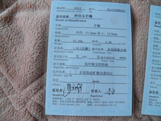 此手镯的鉴定证书照片: |