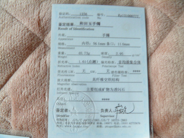此手镯的鉴定证书照片: |