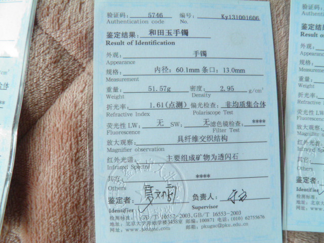 此手镯的鉴定证书照片: |