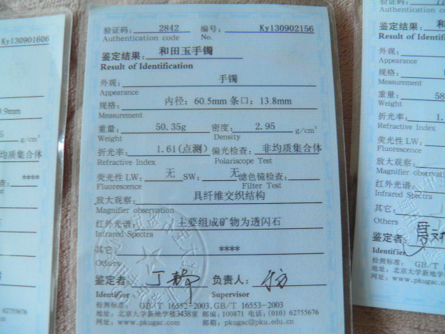 此手镯的鉴定证书照片: |