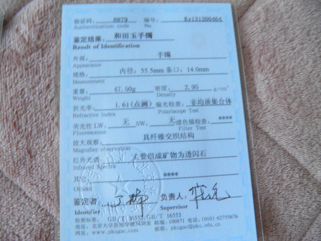 此手镯的鉴定证书照片: |