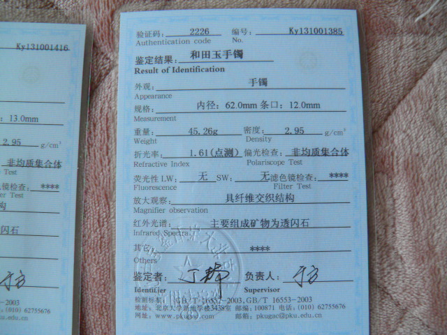 此手镯的鉴定证书照片: |