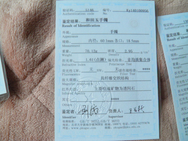 此手镯的鉴定证书照片: |