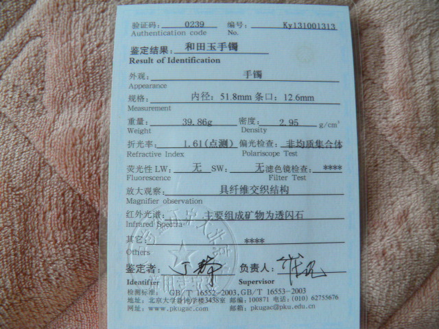 此手镯的鉴定证书照片: |