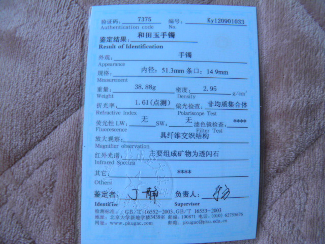 此手镯的鉴定证书照片: |