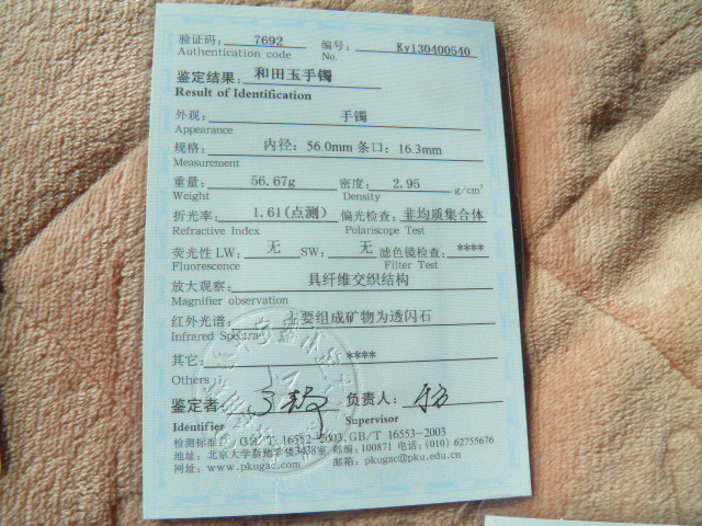 此手镯的鉴定证书照片: |