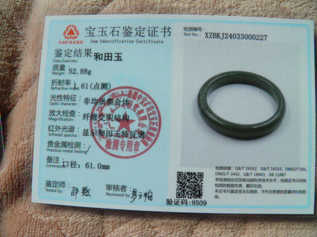 此手镯的鉴定证书照片: |