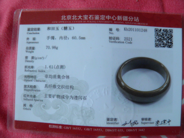 此手镯的鉴定证书照片: |