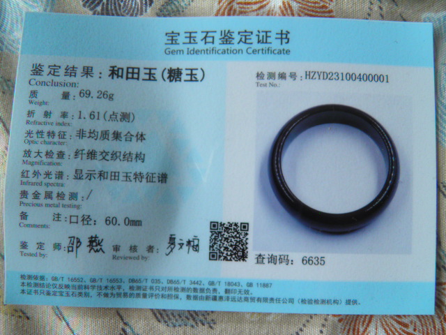 此手镯的鉴定证书照片: |