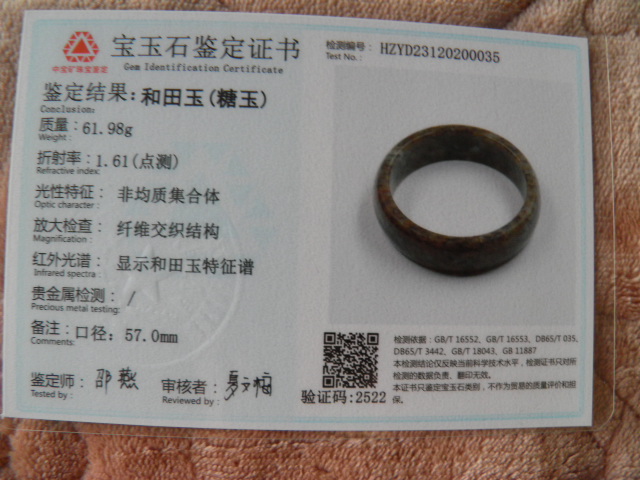 此手镯的鉴定证书照片: |
