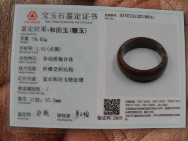 此手镯的鉴定证书照片: |
