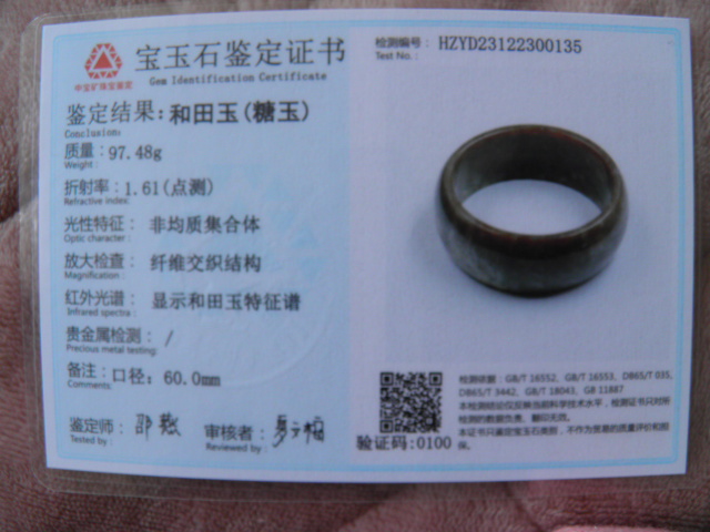 此手镯的鉴定证书照片: |
