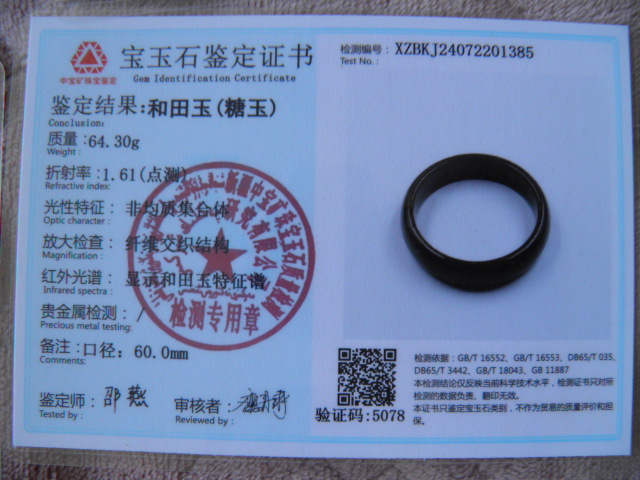 此手镯的鉴定证书照片: |