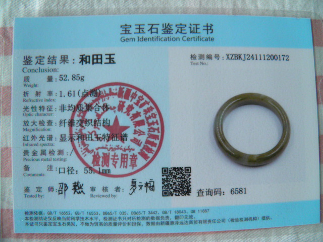 此手镯的鉴定证书照片: |