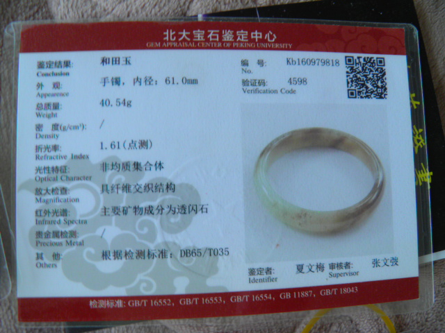 此手镯的鉴定证书照片: |
