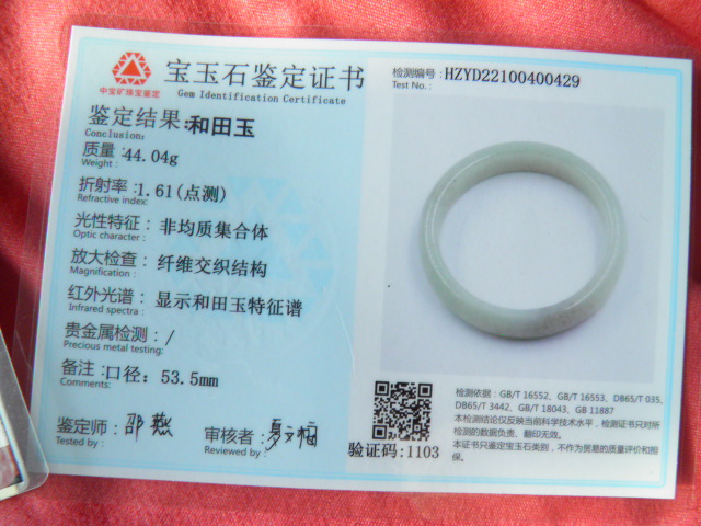 此手镯的鉴定证书照片: |