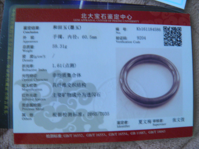 此手镯的鉴定证书照片: |