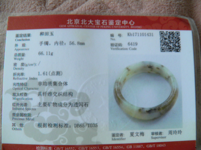 此手镯的鉴定证书照片: |