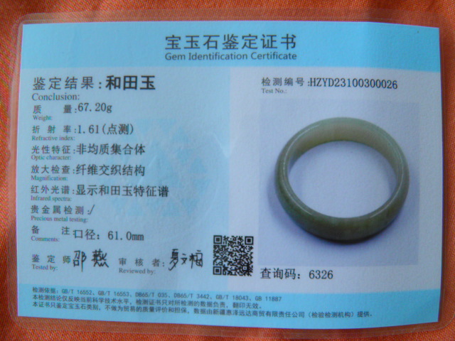 此手镯的鉴定证书照片: |
