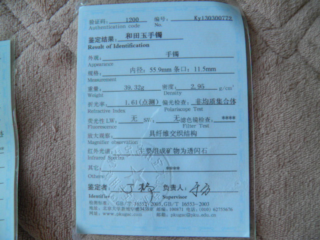 此手镯的鉴定证书照片: |