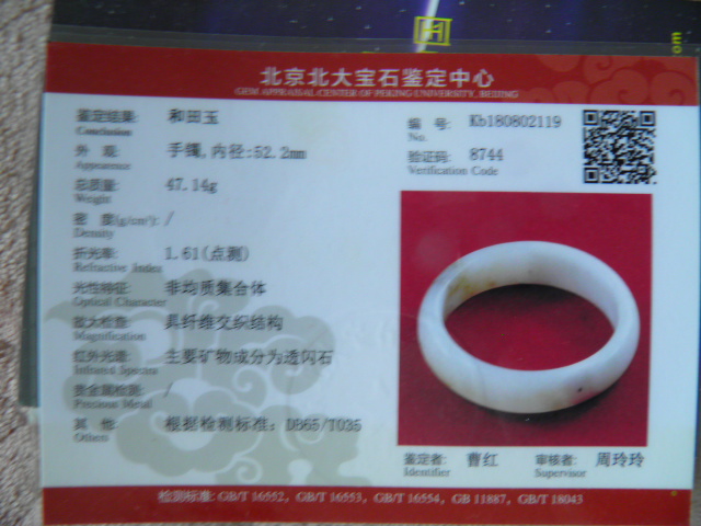 此手镯的鉴定证书照片: |
