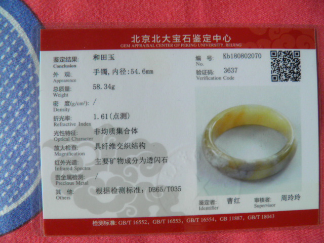 此手镯的鉴定证书照片: |