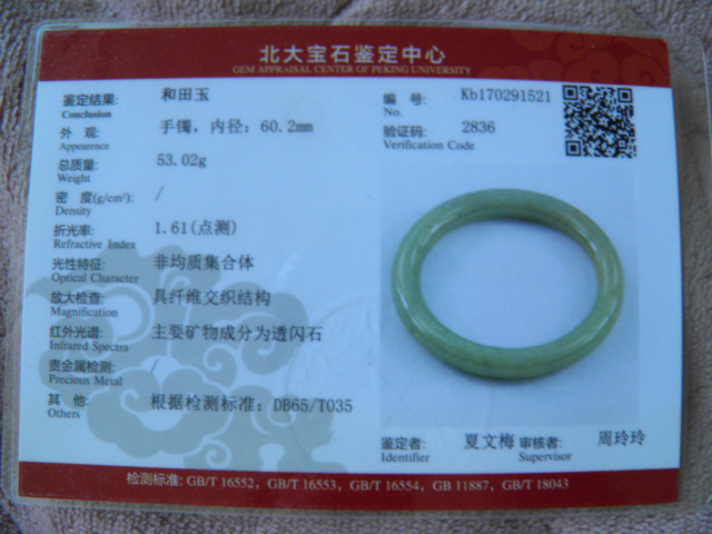 此手镯的鉴定证书照片: |