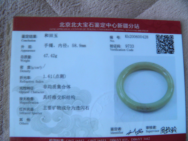 此手镯的鉴定证书照片: |