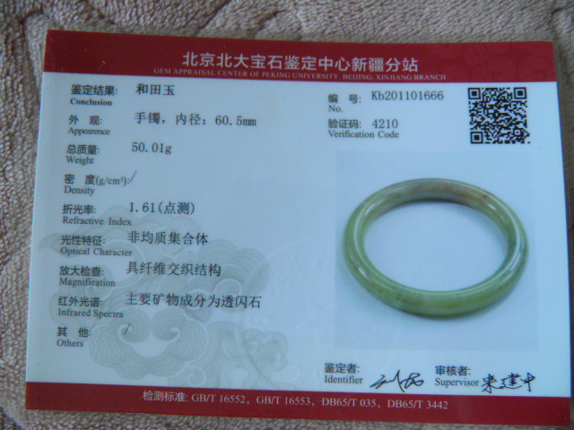 此手镯的鉴定证书照片: |