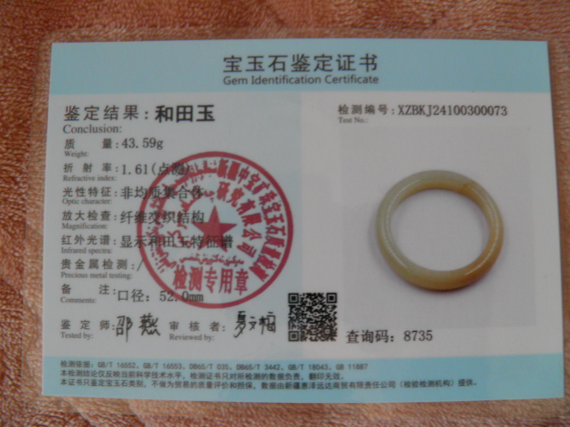 此手镯的鉴定证书照片: |