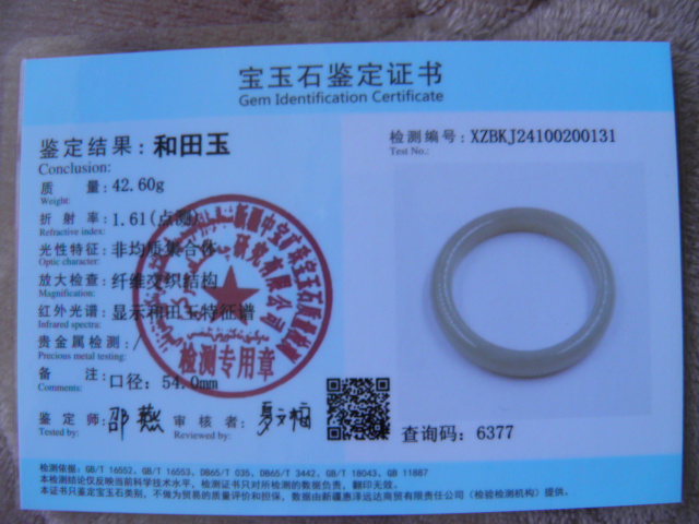 此手镯的鉴定证书照片: |