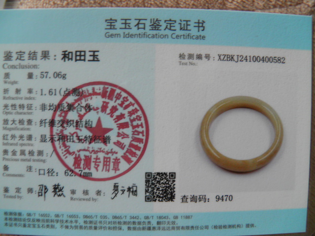 此手镯的鉴定证书照片: |