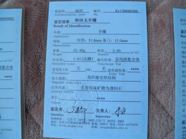 此手镯的鉴定证书照片: |