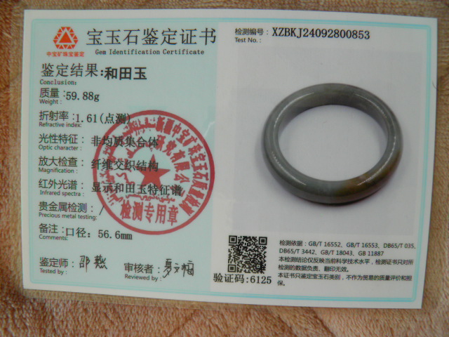 此手镯的鉴定证书照片: |