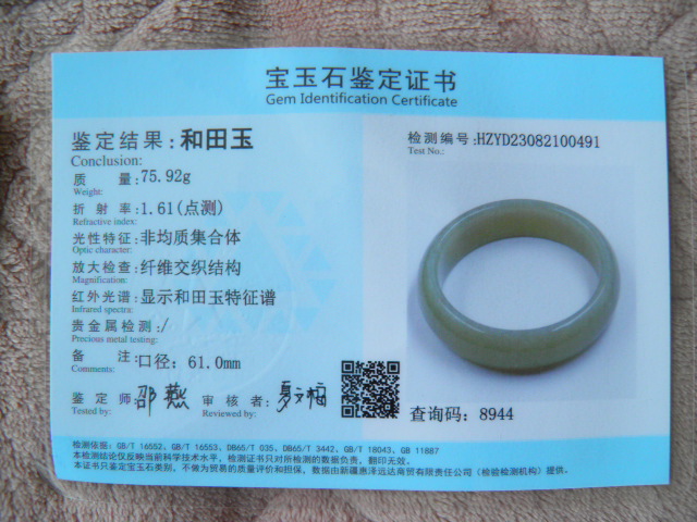 此手镯的鉴定证书照片: |