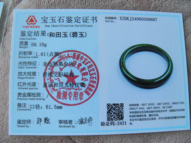 此手镯的鉴定证书照片: |
