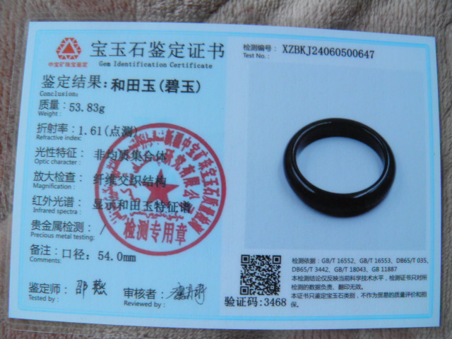 此手镯的鉴定证书照片: |