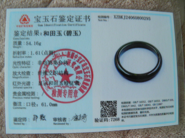 此手镯的鉴定证书照片: |