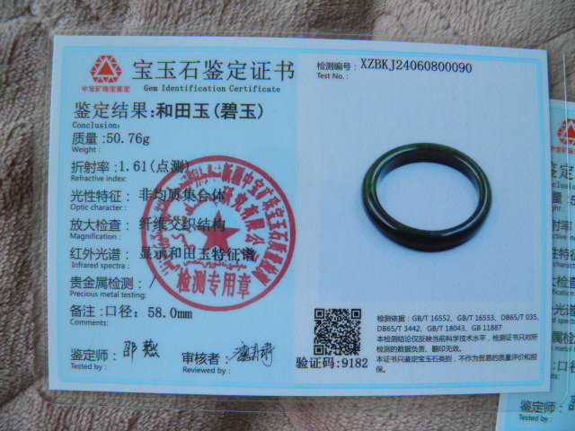 此手镯的鉴定证书照片: |