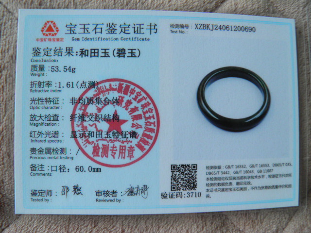 此手镯的鉴定证书照片: |