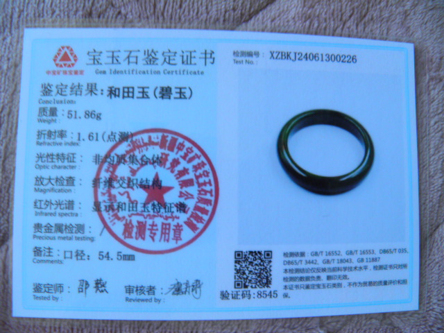 此手镯的鉴定证书照片: |