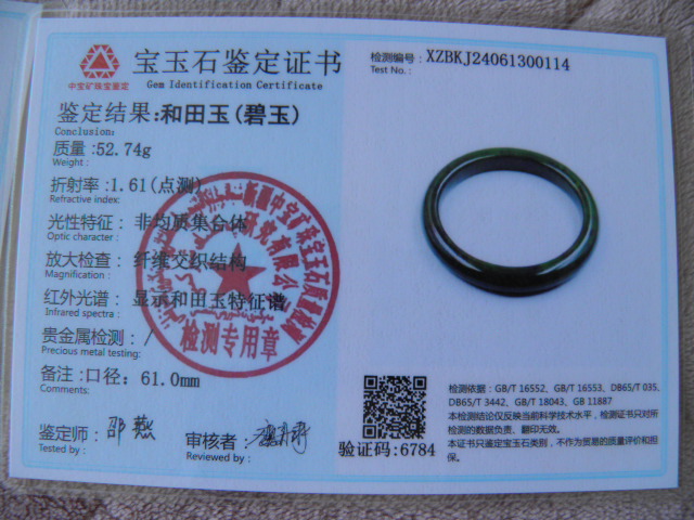 此手镯的鉴定证书照片: |