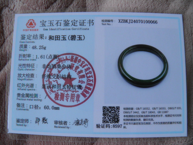 此手镯的鉴定证书照片: |