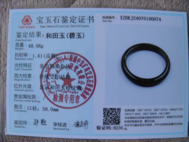 此手镯的鉴定证书照片: |