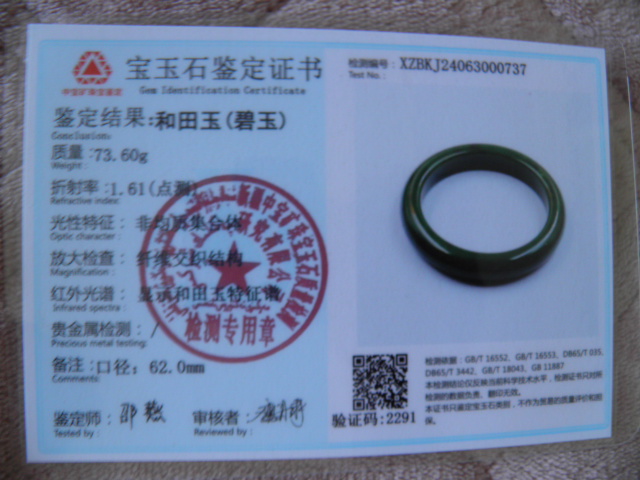此手镯的鉴定证书照片: |