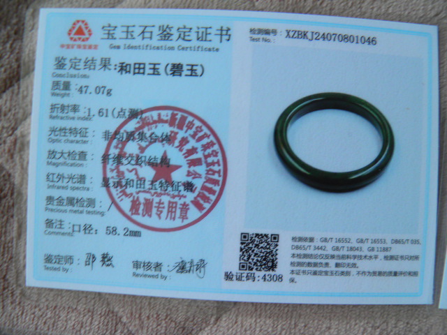 此手镯的鉴定证书照片: |