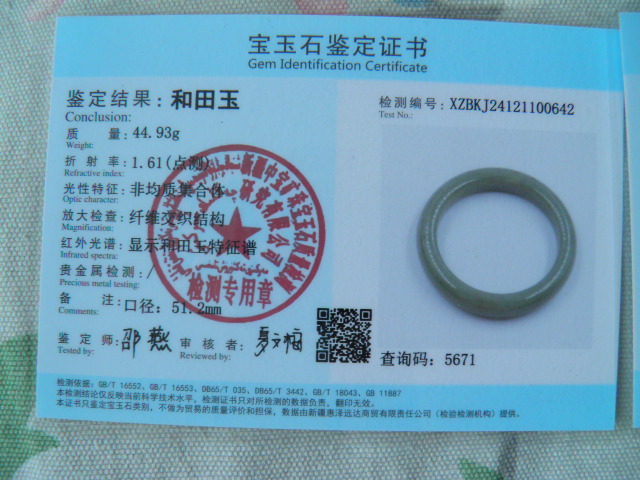此手镯的鉴定证书照片: |